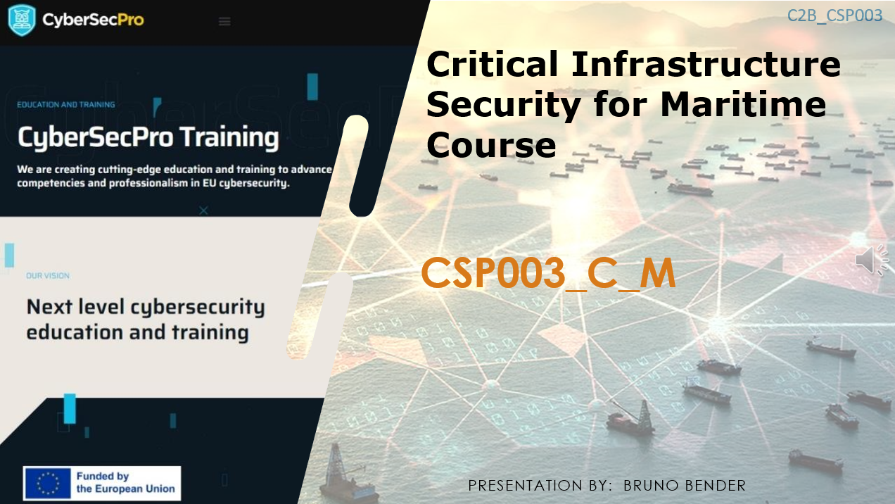 The CSP module 008, as part of the Cybsersecpro education and training project is designed to provide trainees and professionals with the knowledge and skills needed to apprehend evolving cyber threats in the maritime domain. Specifically designed for the maritime sector, this module goes beyond generic cybersecurity training to address the unique challenges of risks and vulnerabilities faced by the maritime administrations and operators. This training is part of EU Innovation Project namely "CyberSecPro". The aim to develop a large variety of materials that can be used by educators and trainers in cybersecurity. CyberSecPro’s ambition is to enhance the role of the Higher Education Institutes (HEIs) in offering hands-on and working-life skills for driving a trustworthy digital transformation in critical sectors of the economy.